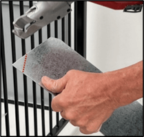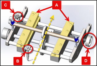 Move steel side-to-side. There should be little to no movement. If there is movement, open the sliding cover and adjust the Infeed guides (A). To adjust, loosen the locking screw (C) and turn the adjustment wheel (D). When steel is firm, unwind the wheel by 1mm (1/32”). The steel should not be hard up against the Infeed rollers. When finished, tighten the locking screw.