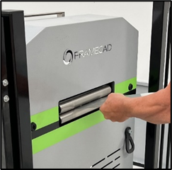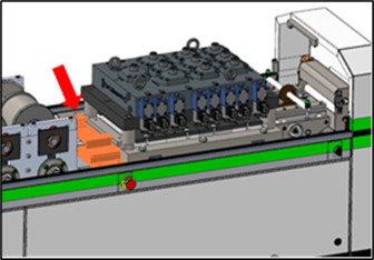 5. Continue inching the strip until it emerges 10cm (3/8”) from the Outfeed end. Then in Factory2, tap Return to get to the home screen (if necessary), and under tools tap Shear > Execute.