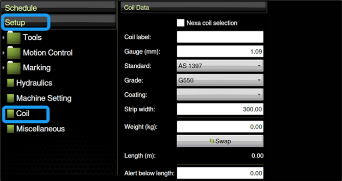 Operators should enter information about a coil in Factory2 every time they feed steel into the roll-former. This allows you to check that the steel in the roll-former matches the steel required in a job you load. It also allows Factory2 to track how much steel remains in a coil.