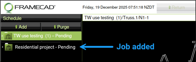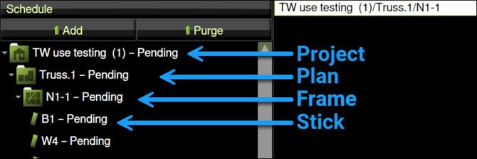 All loaded job files appear in the Menu panel in the Schedule screen. Jobs are listed from top to bottom in the order they will be produced. Each job has multiple folders in a directory-style hierarchy: project, plan, frame and stick.
