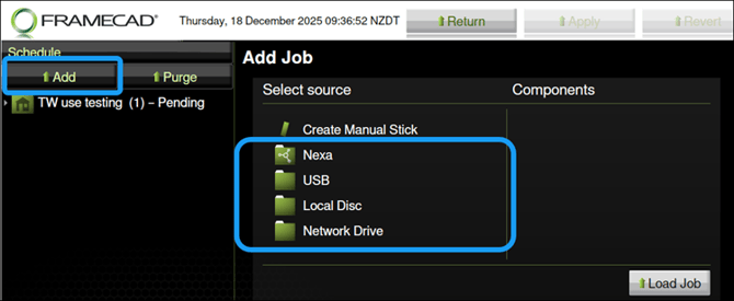 Operators can load a job file from a local disk, a USB drive, a network drive, or FRAMECAD Nexa.