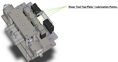 NOTE! Always brush or blow steel dust on and around shear before lubricating.