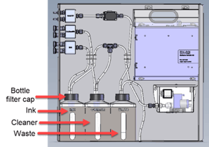 - Visually check bottle fluid levels. If ink or cleaner are near empty, replace bottle. If there is any waste fluid, empty bottle. See below for replacing/emptying bottles.