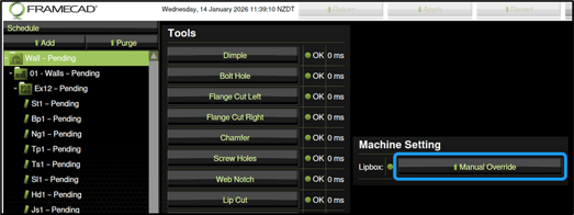 Go to the Operator touchscreen. In the Manual home screen in Factory2 tap Manual Override for the lipbox. The indicator will turn green.