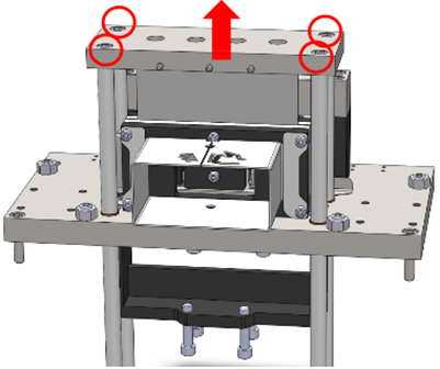 2. Use the 10mm hex key to remove the four top shear plate bolts. Note: the shear blade is secured to the plate with retaining bolt. Lift the top shear plate to remove the plate and blade.