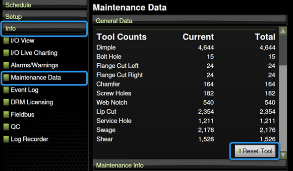 1. Tap Info > Maintenance data. The Maintenance Data window appears. Under General Data, scroll down and tap Reset Tool.