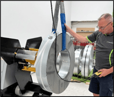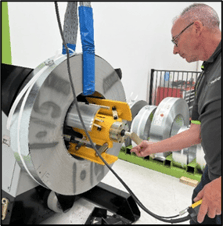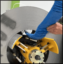 3. Use the decoiler winder handle to collapse (loosen) the mandrel shoe plates. (Lift coil to keep strop taut, if necessary). Turn handle counterclockwise until there is enough space for coil to pass.