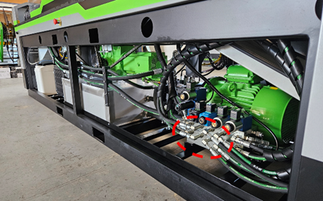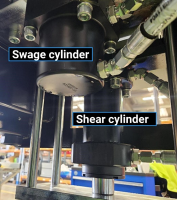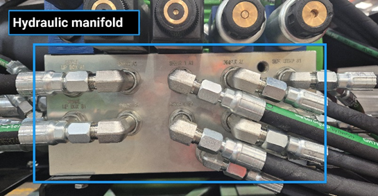 Unlock and remove panels (right side) to access hydraulic system. Check for leaks, cuts or damage to hoses and hose fittings, leaking valves at the hydraulic manifold, and leaks at the top of the toolblock or from cylinders under the swage or shear tools.